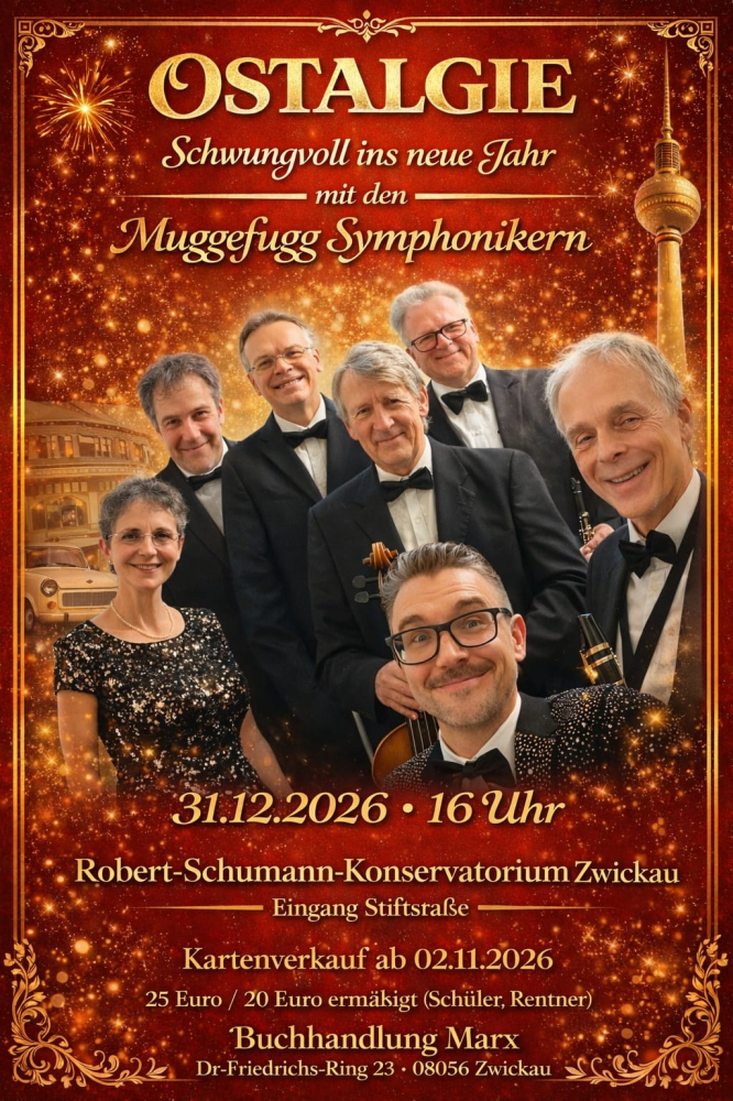 Manche Lieder vergisst man nie. Sie begleiten uns ein Leben lang, erinnern uns an die erste Liebe, an Tanzabende, an Radiomusik im Wohnzimmer. Mit "Ostalgie" laden die Muggefugg Symphoniker und der Sänger Simon Voigtländer zu einer berührenden meusikalischen Zeitreise ein.Am 31.12.2026 um 16:00 Uhr öffnet sich ein Fenster in eine Welt, in der Musik Trost spendet, Hoffnung weckte und Menschen verband. Die Unterhaltungsmusik der DDR war mehr als nur ein Klang - sie war Lebensgefühl, aber auch oftmals die Flucht in eine andere Welt. Das war für viele tatsächlich wichtig: aus dem grauen Alltag zu fliehen durch die Musik.Aus den Melodien der 1950er Jahre bis zur Zeit der Wiedervereinigung ist ein Programm entstanden, das die Seele berührt, Lieder von Holger Biege, Ute Freudenberg, Wolfgang Lippert, Frank Schöbel, Manfred Krug und Dirk Michaelis, ebenso wie Songs von Renft, Karat und Silly lassen eine Epoche wieder lebendig werden. Mal leise und nachdenklich, mal kraftvoll und voller Energie - aber immer echt. Ein Konzert für alle, die mit dieser Musik groß geworden sind - und für jene, die sie neu entdecken möchten.